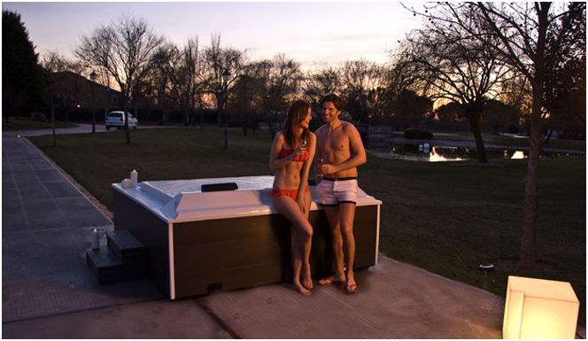 Ce spa aux formes carrées, pourvu des accessoires les plus modernes, répond aux plus hautes exigences et peut accueillir quatre personnes.